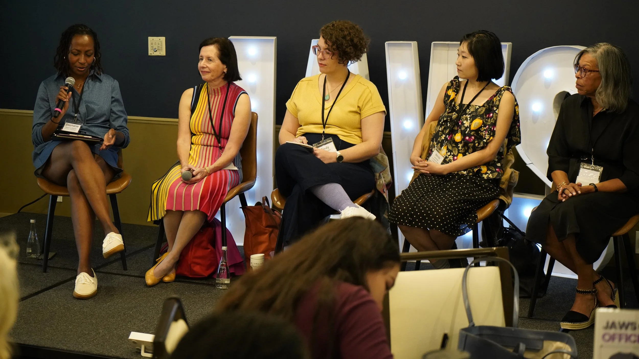 2024-2025 JAWS CAMP Co-Chair Stephanie Beasley (left) in conversation with (seated from second to left to right) Stacy Palmer, Emily Holden, Wendy Wei and Cheryl Mainor Norman at JAWS CAMP 2025 in Washington, D.C. Photo by Larisa Epatko